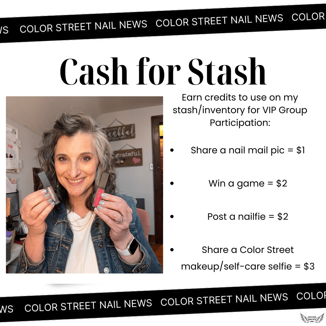 Cash for Stash (Nailfie Challenge with a Twist!)We’re trying something new this month—Cash for Stash! Every picture you share in the VIP group earns credits toward items in my stash/inventory: